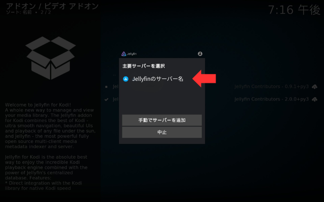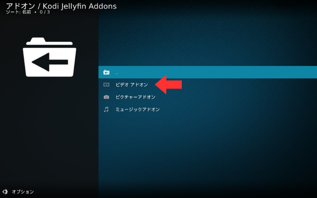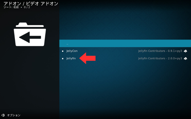 Jellyfin for KODIのインストールが完了したら、下の写真のようにKODIのビデオアドオンにアイコンが表示されます。