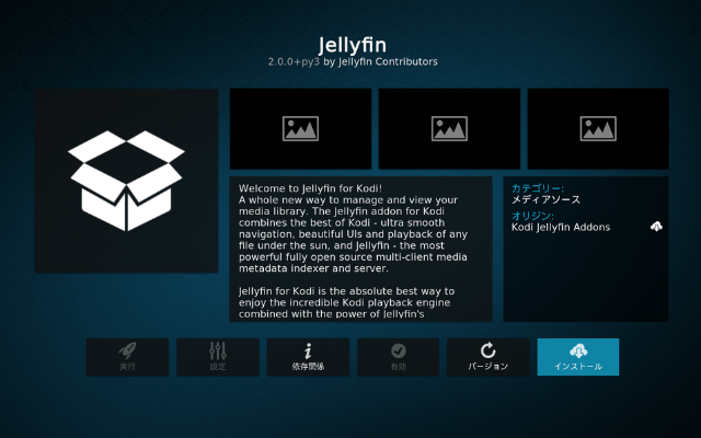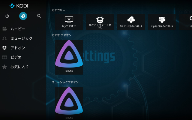 KODIを開く。左上の歯車マーク;設定→ファイルマネージャー→ソースを追加→<無し>をクリック→パスを入力するかメディアの場所を参照に「https://kodi.jellyfin.org」、このメディアソース名の入力に「Jellyfin Repo」と記載し、OK。設定→アドオンブラウザへ移動し、「ZIPファイルからのインストール」を選択する。「Jellyfin Repo」内のrepository.jellyfin.kodi.zipを選ぶとインストールされる。