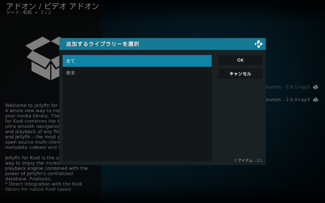 設定→アドオン→アドオンブラウザから「リポジトリからインストール」を選択→「jellyfin.kodi Addons」を選択→「ビデオアドオン」に進むと「Jellyfin」を選んでインストールする。