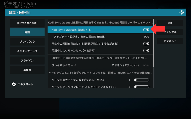 ホーム画面→「アドオン」→「ビデオアドオン」→「Jellyfin」を開く→設定→同期→「Kodi Sync Queue」を有効にする。