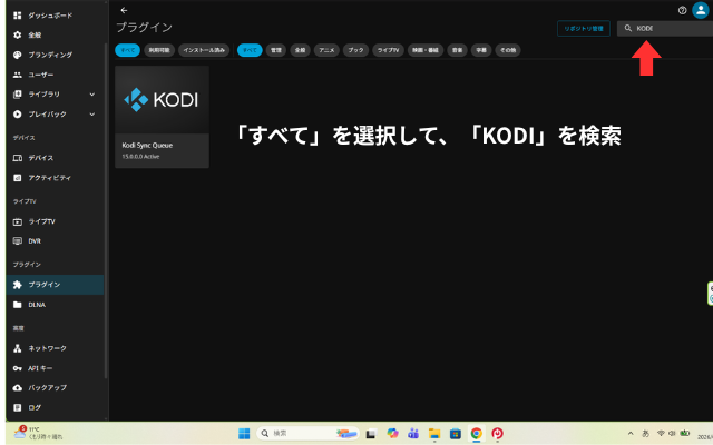 NASのJellyfinにサインインしたら、(左上三本線;メニュー)→ダッシュボード→プラグインに進む。「すべて」のプラグインを選択して、検索から「KODI」でプラグインが見つかるのでインストールする。