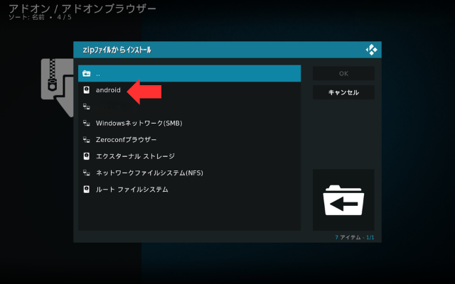 KODIはSDカードを入れないとファイルーマネージャに「android」フォルダが現れません。「android」フォルダ=「SDカード」になります。SDカードがなければ「AndroidTV・FireTVデバイスの場合」の方法でもインストールできる。