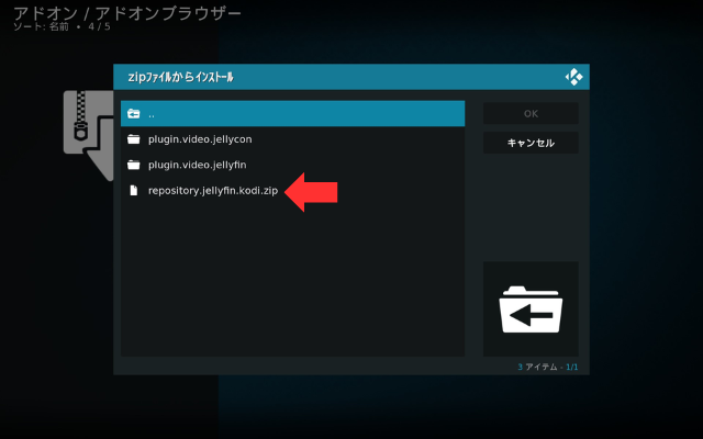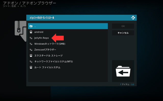 Jellyfin KODIリポジトリ(ZIPファイル)をhttps://kodi.jellyfin.org/repository.jellyfin.kodi.zipダウンロードする。androidタブレット場合、SDカードに保存する。KODIを開いて、右上歯車;設定→アドオンブラウザ→ZIPファイルからインストールを選択→「android」の中の先ほどダウンロードしたファイルを選択するとインストールされる。