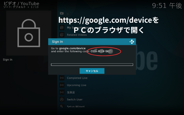 PC(スマホでもOK)のブラウザでhttps://google.com/deviceを開く。コード入力画面になる。KODIに表示されたコードを入力します。3回繰り返すので、コード入力アドレスhttps://google.com/deviceはブックマーク等で保存しておいたほうがスムーズに処理できます。