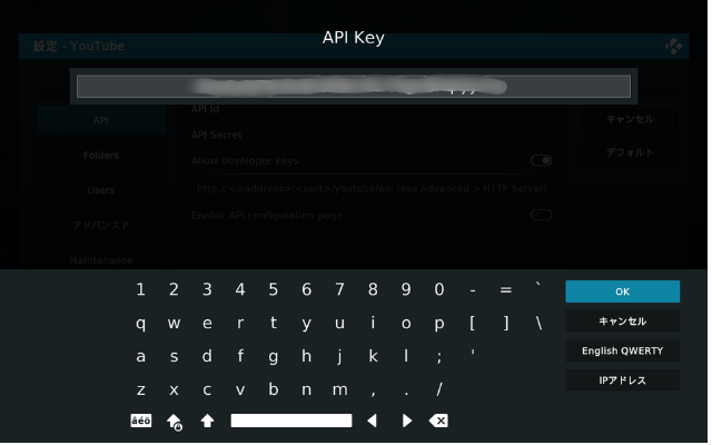 「official KODI Remote」のテキスト欄にAPIキーをコピペすると、同期されてKODIにキーが入力されます。これをあとの2つのAPIを繰り返して、入力を完了する。API Idは.apps.googleusercontent.comの部分は必要ありません。その前の英数字のみ入力してください。