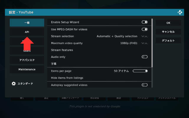 ビデオアドオンの中、下にスクロールするとYouTubeが見つかります。それをインストールします。インストール後、設定に進みます。