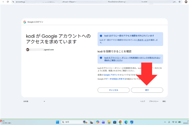 また、再度入力画面に戻る。同じようにコードを入力する。「KODI」の場合は「続行」で進みます。