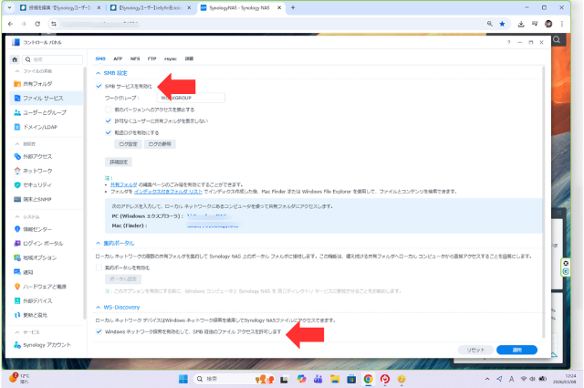 SMBを有効にするにはSynologyNASのコントロールパネル→ファイルサービス→SMB設定「SMB サービスを有効化」とWS-Discovery「Windowsネットワーク探索を有効化して、SMB経由のファイルアクセスを有効化を許可します」をチェックを入れて適用します。