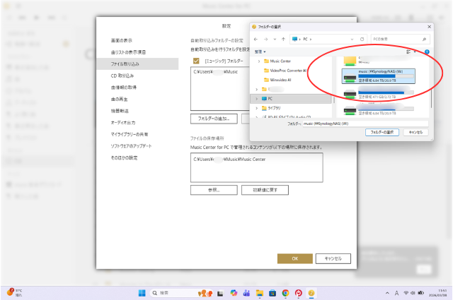 ファイルの取り込み先を設定します。ファイルの保存場所の「参照」から先ほど作成した共有フォルダmusicのマウントフォルダを指定する(私はWをドライブ文字にしたので、W:\と表示されました)。この設定をすると直接、NASに保存することができる。設定しない場合は、デフォルトでは自動取り込みを行うフォルダと同じ場所に保存される。