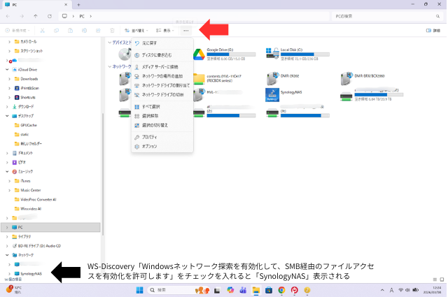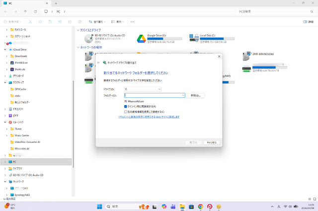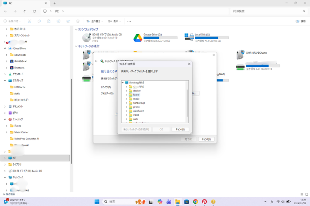 エクスプローラーに戻り、左のウィンドウでPCを選択する。上部のタブ内(・・・)を押し、「ネットワークドライブの割り当て」を選択する。ドライブ欄の一覧でドライブ文字を選択します(「Z:」など」。次にフォルダは【参照】を押すとネットワークに共有可能なフォルダの一覧が表示されているので、NASの中から「music」を選んで完了する。【参照】はSMB設定でネットワーク探索を有効化したNASが表示されるので、ネットワーク探索を有効化していない場合は\\192.168.1.〇〇\musicにNASのIPアドレスを入力する。あるいはサーバー名※がSynologyNASであれば\\SynologyNAS\musicでもいい。その後、ユーザー名とパスワードを聞かれるので、NASにログインする際のユーザー名とパスワードを入力したら、エクスプローラー内にマウントフォルダが作成される。