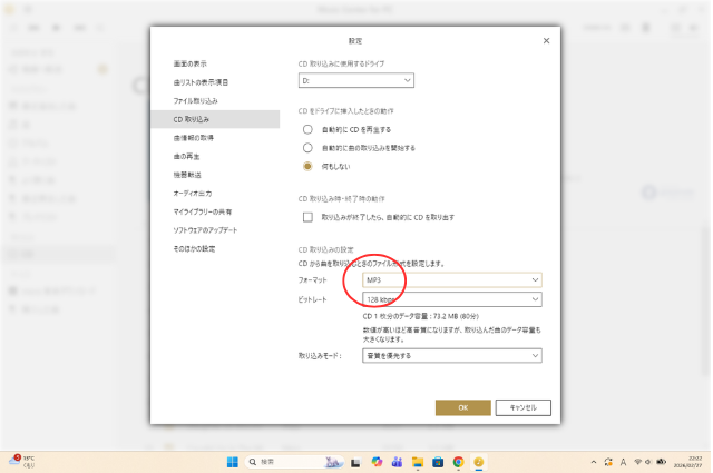 フォーマットはMP3をお勧めします。取り込みモードは私は「音質を優先」にしました。