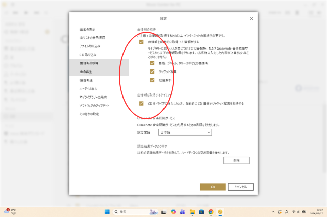 すべて(曲情報を自動的に取得・12音解析する/曲名・ジャンル・リリース年などの曲情報/ジャケット写真/12音解析)選択する。