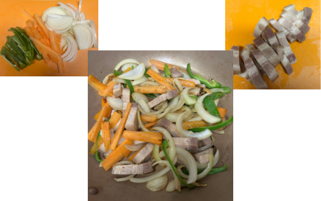 玉ねぎ・人参・ピーマン・スーチカーは適当な大きさに切り、すべて一緒に炒めます。野菜がしんなりしてきたら、トマトソースを加えます。少しソースは煮詰めたほうが絡みやすくなります。