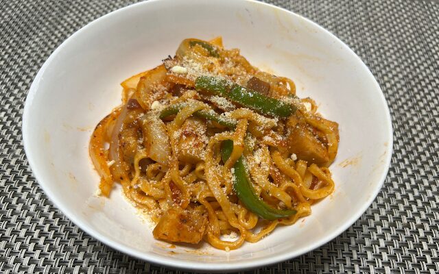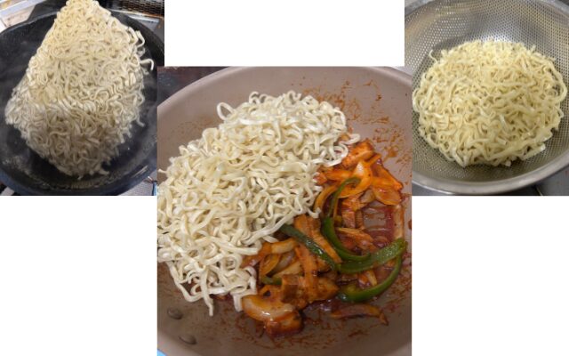 冷凍した沖縄そばを熱湯にいれます。解凍と余分な油をとるためなので20秒ほどでかまいません。水分を切って、先ほどのソースに絡め、コショウを振って出来上がり。ソースが濃い目なので塩は必要ありません。ケチャップを使用する場合は少量のウスターソースとコンソメ顆粒を加え、塩で味を調えるといいと思います。